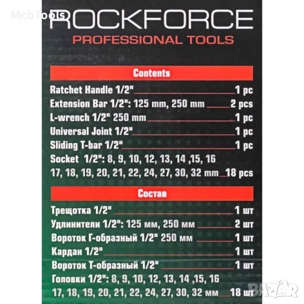 • 18 бр. вложки: 8, 9, 10, 12, 13, 14, 15, 16, 17, 18, 19, 20, 21, 22, 24, 27, 30, 32 мм.