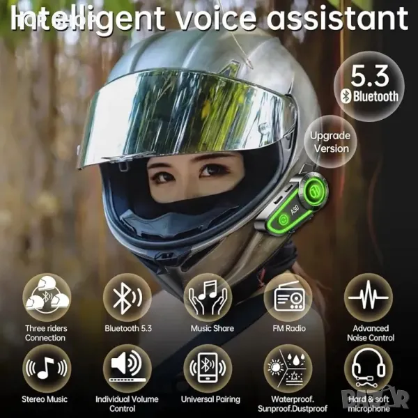 Ултратънък високоговорител: дебелината на високоговорителя за слушалки за мотоциклетна каска е само 0,38 инча. Слушалките с каска не притискат ушите ви. Интелигентен гласов асистент, щракнете два пъти върху бутона минус (-), за да стартирате гласовия асистент.