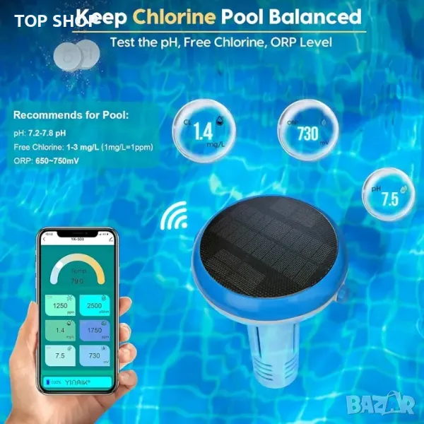 Тестер за свободен хлор и pH: Препоръчва pH 7,2-7,8pH и концентрация на свободен хлор от 1-3 mg/L в басейни; Мониторът за pH и хлор YINMIK може да тества както свободния хлор, така и pH, за да знае, че и двете нива са в оптималния диапазон за чист басейн