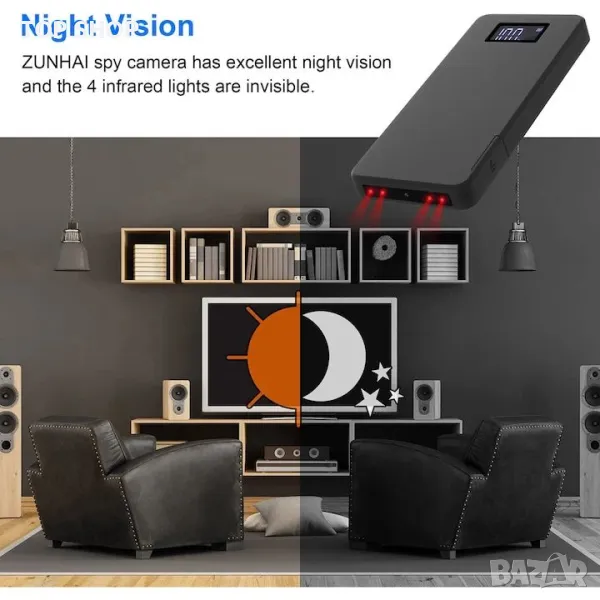 4K скрита камера с голям капацитет. Формата на скритата камера ZUNHAI е power bank. Може да се използва не само като powerbank, но и като незабелязана скрита камера. Има 4K пиксели с висока разделителна способност и вградена 10000mAh акумулаторна литиева батерия, която може да осигури около 40 часа видеозапис и поддържа зареждане по време на запис.