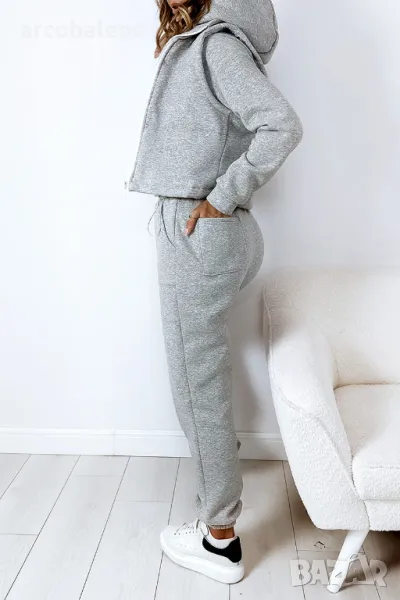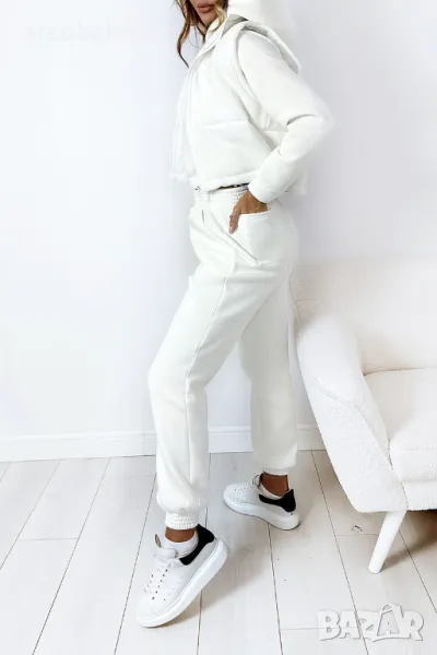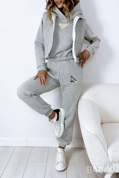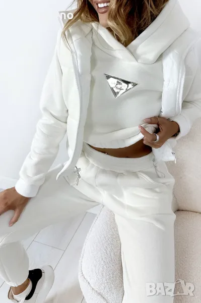 Дебел анцуг, състоящ се от дълъг панталон, удобен суичър с качулка и оригинална жилетка без ръкави. Суичърът има еластична, ненатискаща лента в долната част. Спортни панталони с висока талия. Комплектът създава красиво цяло, което не може да липсва в гардероба ви за есенно-зимния сезон.