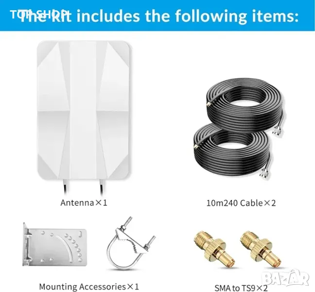 Пълен пакет: Нашият антенен комплект включва не само 1 N-тип конекторна антена, но и 2 10m N-SMA коаксиални кабела с ниски загуби, 2 SMA-TS9 адаптера и комплект монтажни комплекти. Тази интегрирана и цялостна поддръжка осигурява най-доброто потребителско изживяване по време на инсталиране и използване, опростявайки целия процес на настройка.