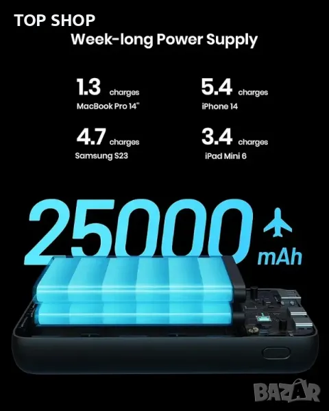 ✅【25000mAh за една седмица】Огромното захранване може да зарежда MacBook Pro 14" 1,3 пъти или iPad Mini 6 3,4 пъти, в изобилие дори за устройства с огромен капацитет.