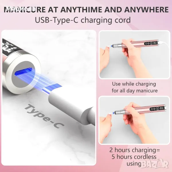 Тази безжична пила за нокти може да работи до 5 часа след едно пълно зареждане, което означава, че можете да обслужите 60 клиента без зареждане! Може да се използва и докато се зарежда за целодневен маникюр! Пълното зареждане отнема само 2 часа.