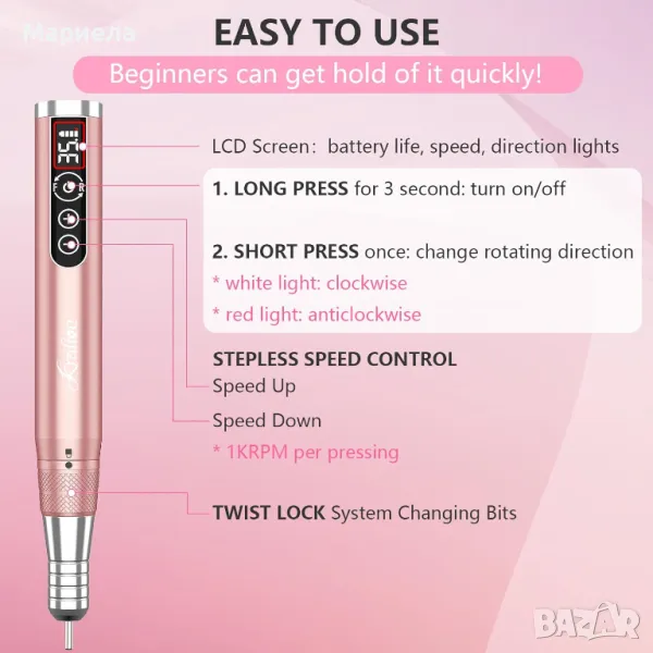 За разлика от друга акумулаторна електрическа пила за нокти, която може да задава само 3 до 5 нива на скорост, тази може да се регулира от 0 до 35 000 оборота в минута със стъпки от 1KRPM, безопасна за естествени нокти, но мощна за акрилни нокти. LCD екранът показва моменталната скорост, оставащата батерия и посоките на въртене, което е лесно за използване.