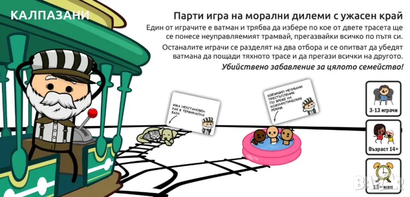 Трамвай "Терзание" е парти игра, в която играчите поставят морални дилеми на ватмана под формата на карти, наредени по двете трамвайни линии, по които той може да поеме. Ватманът се сменя всеки рунд, а остналите играчи се разделят на отбори, които се опитват да го накарат да избере линията на противниците си, поставяйки карти с позитивни персонажи пред себе си.
