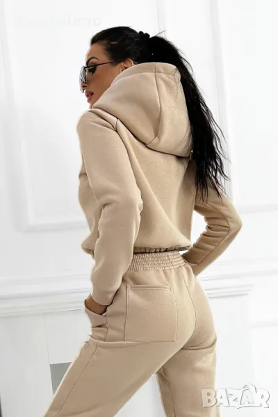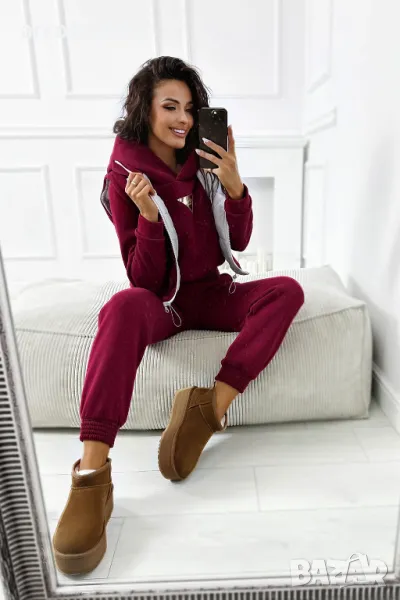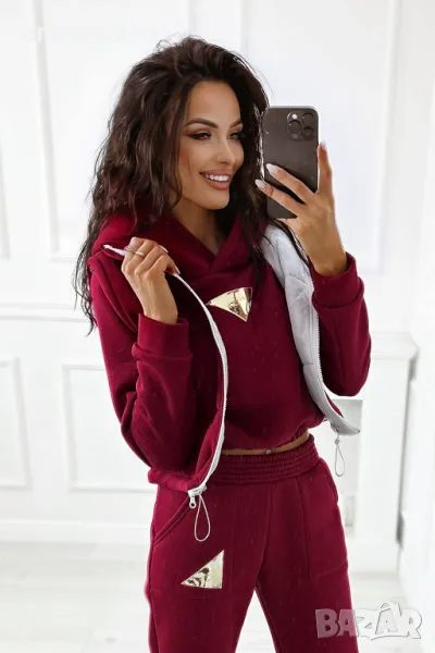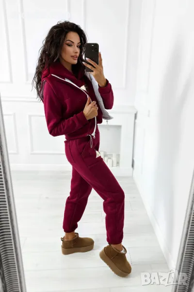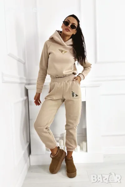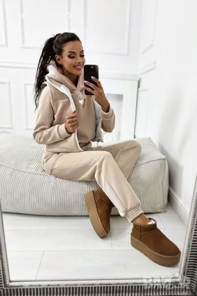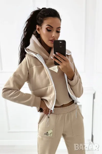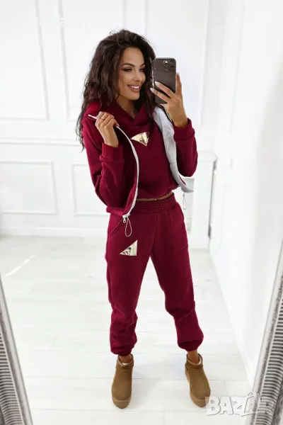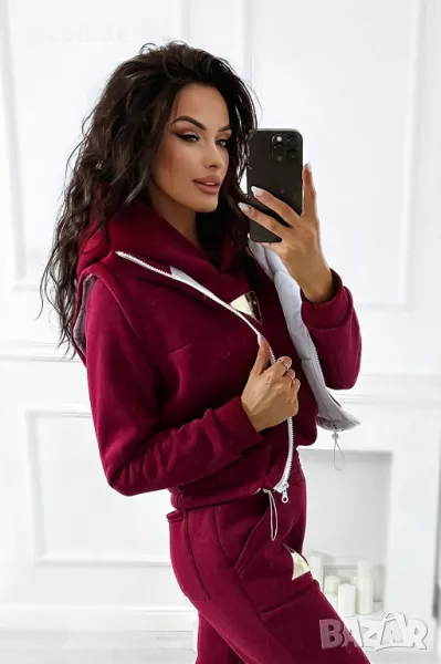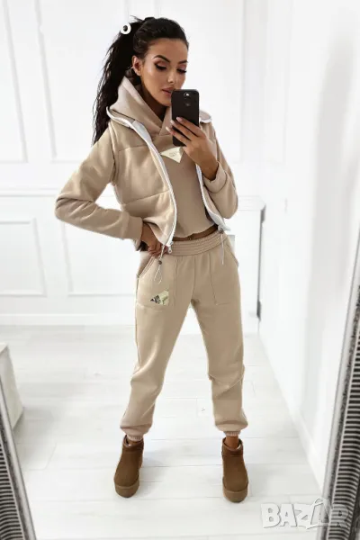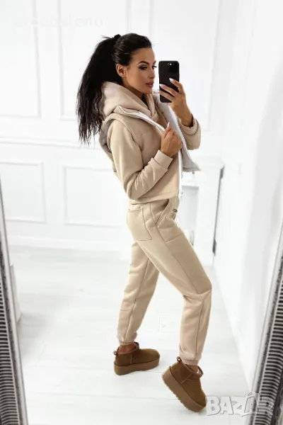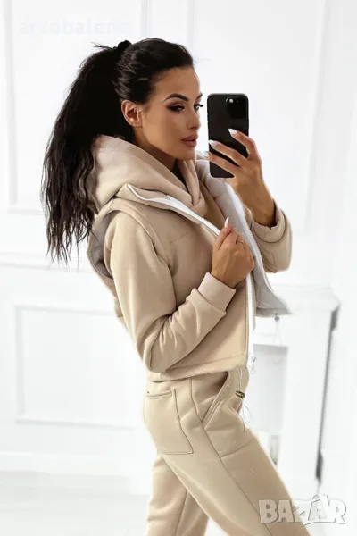 Дебел анцуг, състоящ се от дълъг панталон, удобен суичър с качулка и оригинална жилетка без ръкави. Суичърът има еластична, ненатискаща лента в долната част. Спортни панталони с висока талия. Комплектът създава красиво цяло, което не може да липсва в гардероба ви за есенно-зимния сезон.