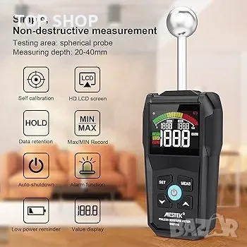 Професионално и точно измерване, без разрушаване】Влагомер с високопрецизна сонда от сплав и високопроизводителен чип за обработка, точно измерване, бърза реакция, обхват на измерване до 0,0-100,0. С функция за запазване на данни. Без поставяне на електроди или сонди в материала за измерване, високочестотните вълни на влагомера могат да проникнат на около 40 мм в зидарията и измерването на влагата няма да повреди повърхността на обекта.