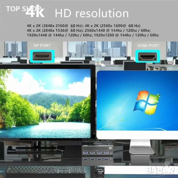 HDMI + DP порт KVM превключвател: Това е перфектен KVM превключвател за DP и HDMI портове за споделяне на клавиатура, мишка и монитор. Когато е в режим на копиране, основният екран може да бъде копиран на втория изходен екран. Когато сте в разширен режим, прозорецът на главния екран може да бъде плъзнат до втория изходен екран.