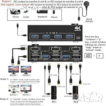 【Поддържа 2 режима на превключване】 Поддържа физически бутон и кабелно управление. Само когато компютърът ви поддържа двоен дисплей или мулти дисплей, можете да използвате този DP HDMI KVM превключвател, за да постигнете два компютъра за споделяне на два монитора, да изберете разширен режим или режим на копиране на вашия компютър.