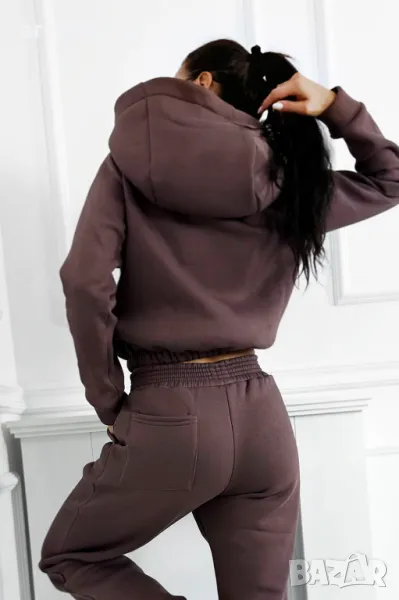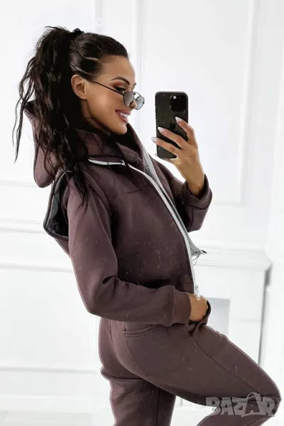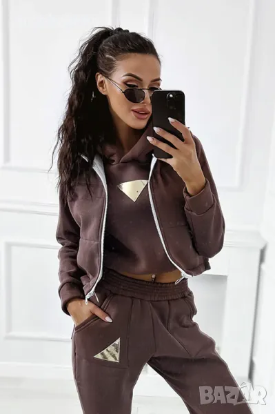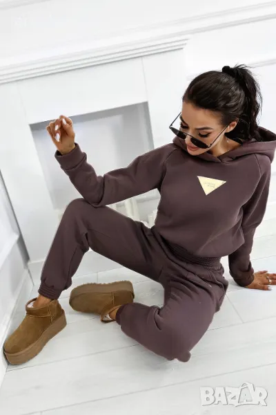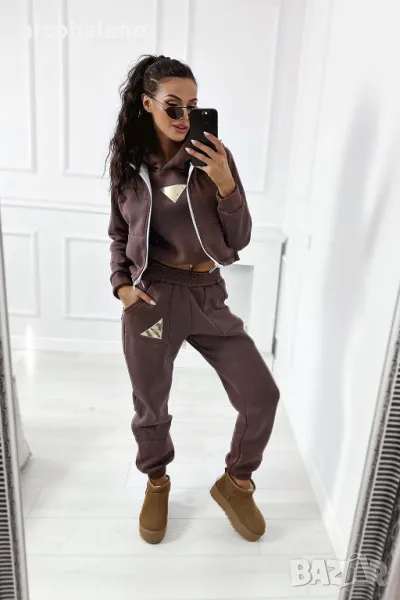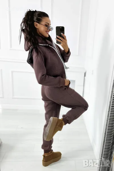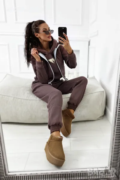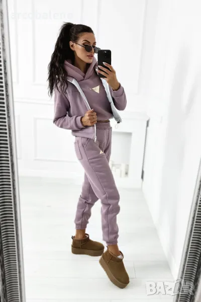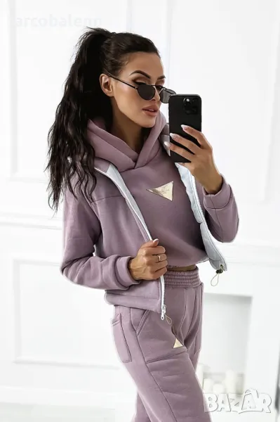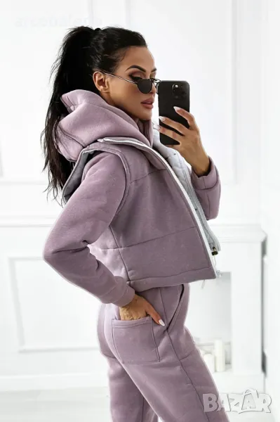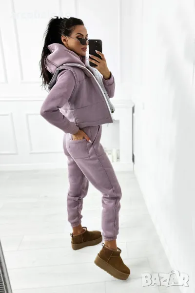 Дебел анцуг, състоящ се от дълъг панталон, удобен суичър с качулка и оригинална жилетка без ръкави. Суичърът има еластична, ненатискаща лента в долната част. Спортни панталони с висока талия. Комплектът създава красиво цяло, което не може да липсва в гардероба ви за есенно-зимния сезон.