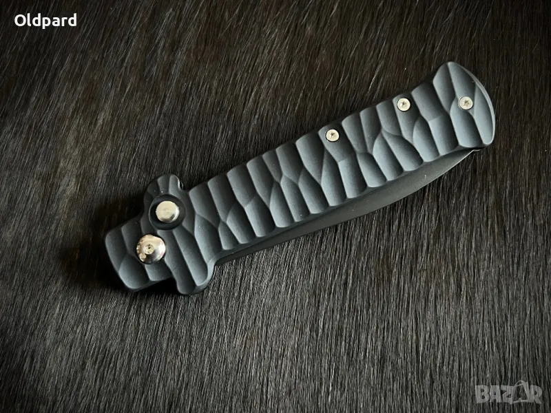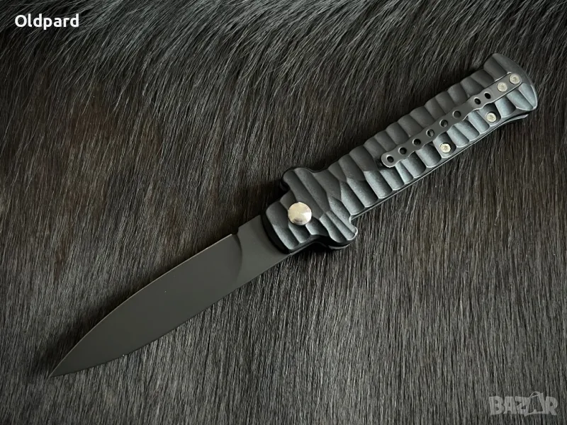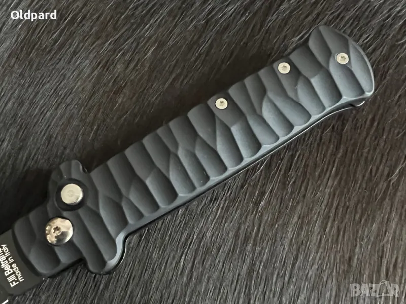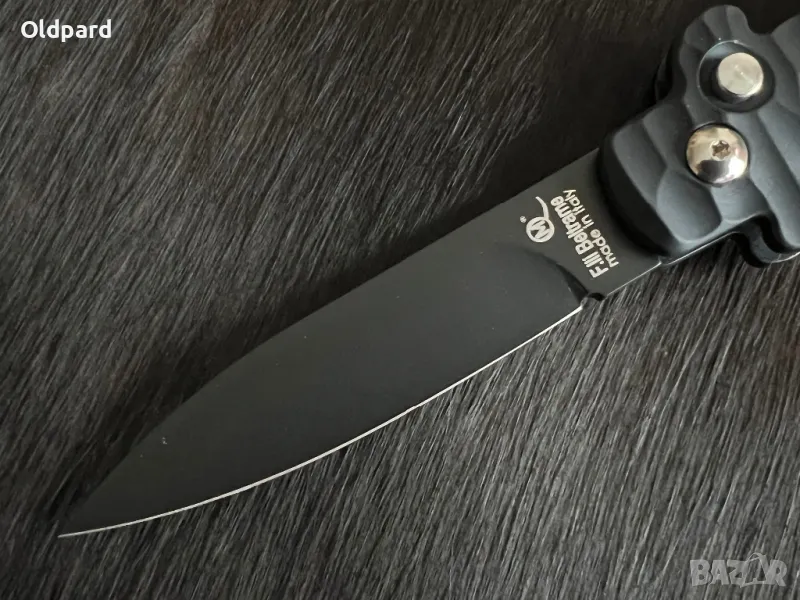 Оригинален нож Beltrame произведен в Италия! Дръжка от леки алуминиеви части. Произведено от Frank Beltrame (Италия) - един от най-добрите специалисти по пружинни ножове. Дръжка с 3D Frosted десен, черна анодизирана. Щипка за носене в джоб. Най-острото острие е от стомана 440А, в същия цвят като дръжката - черен. Перфектно пасване и сглобяване на всички части. Обща дължина 20 см. Рядък и красив нож за колекция или за ценители на ножарската естетика.