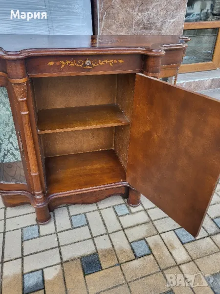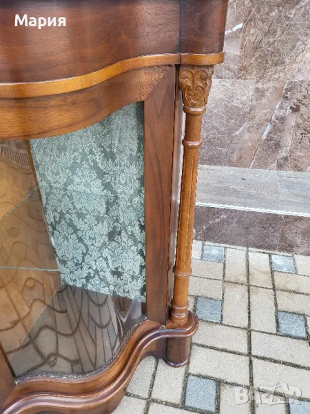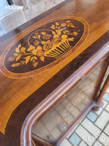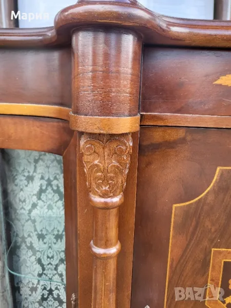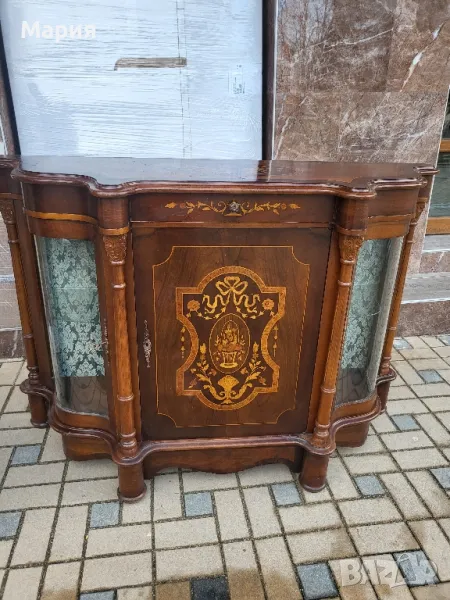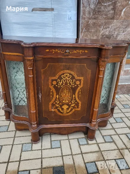 Изработен от масивно дърво,кристални извити стъкла и богато декориран с интарзия.