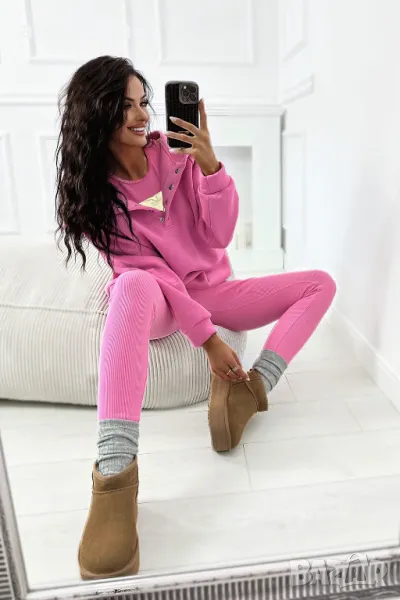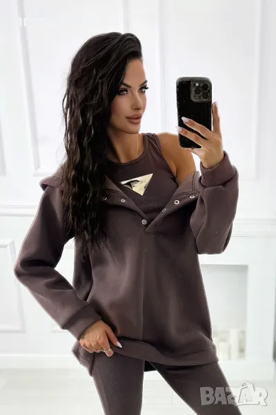 Комплект анцуг, състоящ се от изолиран oversize суичър с копчета, рипсен клин и горнище с декоративна пластина. Мегаудобна памучна материя - чудесна основа за спортен стайлинг!