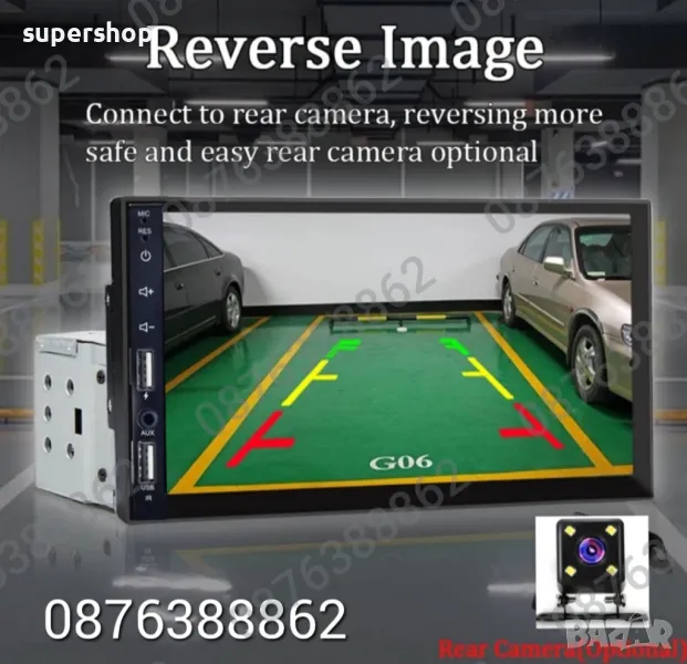МР5 плеър с включена камера за задно виждане, Fm радио, слотове за флашка USB, AUX вход, Bluetooth стрийм за музика и телефонни разговори, устройството разполага с вграден микрофон.