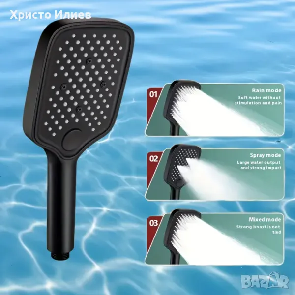 - Ръчен душ с възможност за регулиране на височината и ъгъла и три режима на работа и бутон за превключване между тях