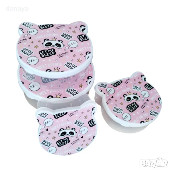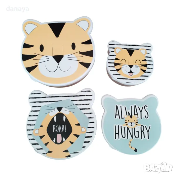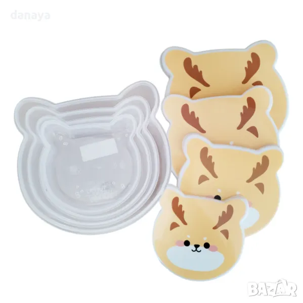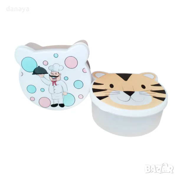 Комплект от 4 броя детски кутии за храна в 4 различни размера. Съвсем по детски, формата и дизайнът ще се хареса отлично на децата. Чудесни са за приготвяне на обяд за училище или за по-дълги разходки навън. Кутиите се предлагат в 4 варианта – тигър, готвач, еленче, панда.