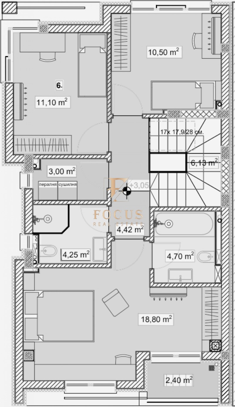 - втори етаж - коридор, три спални, две бани с тоалетни и балкон.