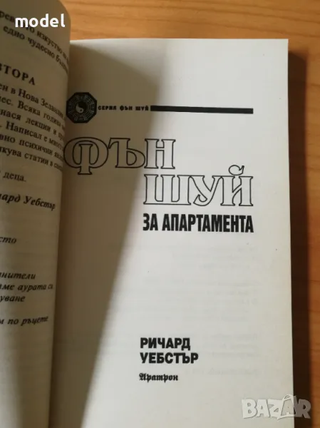 ентусиазмът ви за живота ще нарасне. Независимо дали живеете в апартамент с няколко стаи, едностайно студио, или шикозен апартамент, можете да направите някои фини промени в жизненото си пространство, които буквално ще преобразят живота ви. Хората, които прилагат принципите на фън шуй, се отличават със значителни успехи във всички области - в любовта, във финансовата сфера, в кариерата, в семейството, имат добро здраве, дори получават повече признание за постиженията си във всяка област. Книгата на Ричард Уебстър "Фън шуй за апартамента" съсредоточава вниманието ви върху това, как да повишите хармонията и благотворната енергия в апартамента си, като влагате сравнително малко средства или дори без никакви разходи, за да привлечете добрия късмет, благополучието и спокойствието.