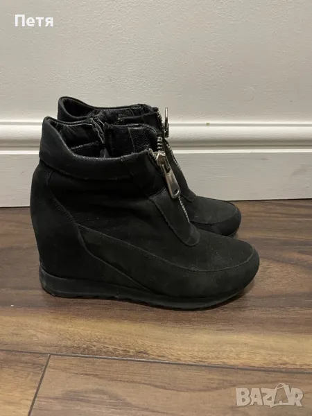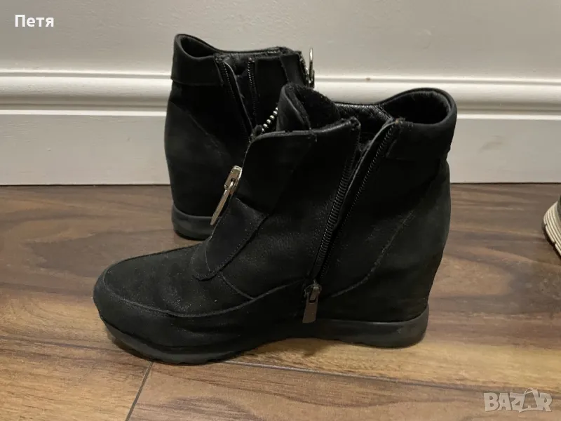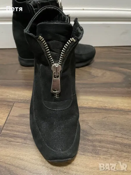 Велурени боти в изключително добро състояние.Запазени и много удобни.Имат цип от вътрешната страна ,който е за обуване и събуване.Ципът отпред е за раздвижване на модела.ботите са тип платформи.