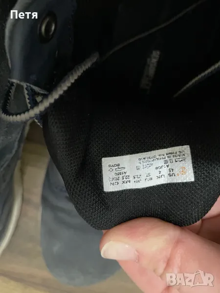 Боти от естествен материал на фирмата Timberland.Много леки и удобно но видимо избелели и леко износени,но пък здрави.Избрлвеснето се получи от изпиране .