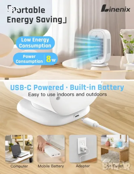 Безопасен и енергоспестяващ избор】 Въздушният охладител не изисква компресор или химически хладилен агент и може да създаде здравословна среда. Той консумира само 10 W/час, предназначен е за лична употреба и поддържа различни USB режими на захранване, което го прави по-енергийно ефективен от други климатици.