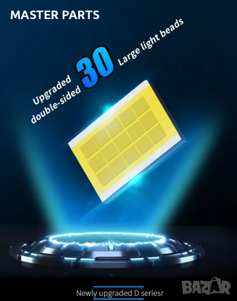 Лумени: 58 000 LM, оборудвани със супермощни LED CSP чипове от двете страни (по 30 чипа на страна)