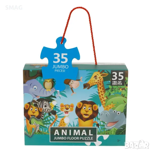 Детски подов пъзел с 35 големи джъмбо части 14x10 см, които образуват изображение от джунглата с диви животни.