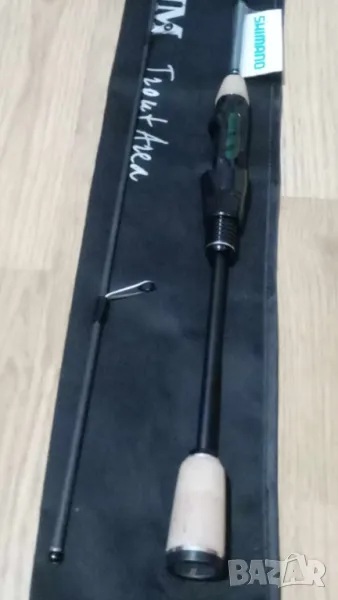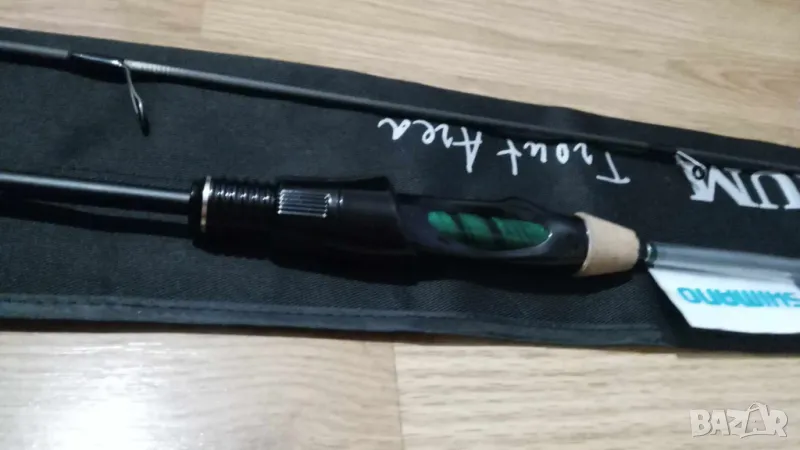 Карбоновата бланка е с бавна акция, позволяваща използването на ултра тънки линии и запазването на контакта и контрола по време на борба, когато примамката ви е с куки без контра на върха и има опасност от лесно измъкване. Окомплектовката включва водачи Fuji Alconite KR-type и изключително красив и олекотен макародържач Fuji със сигурно заключване и повишена здравина в сравнение с по-ниските класове. Елегантната визия се допълва от коркова сплит ръкохватка и страхотен, преливащ в зелено и черно десен на бланката, но най-хубавото е, че с подобен инструмент от Trout Area моделите на Shimano истинското удоволствие от ултра лайт риболова на пъстърва е гарантирано!