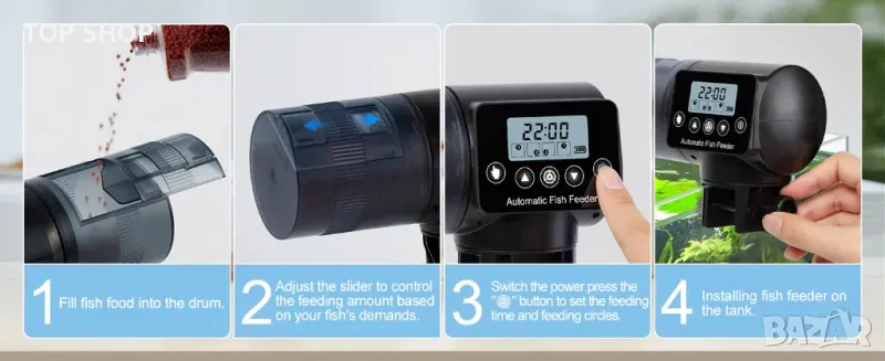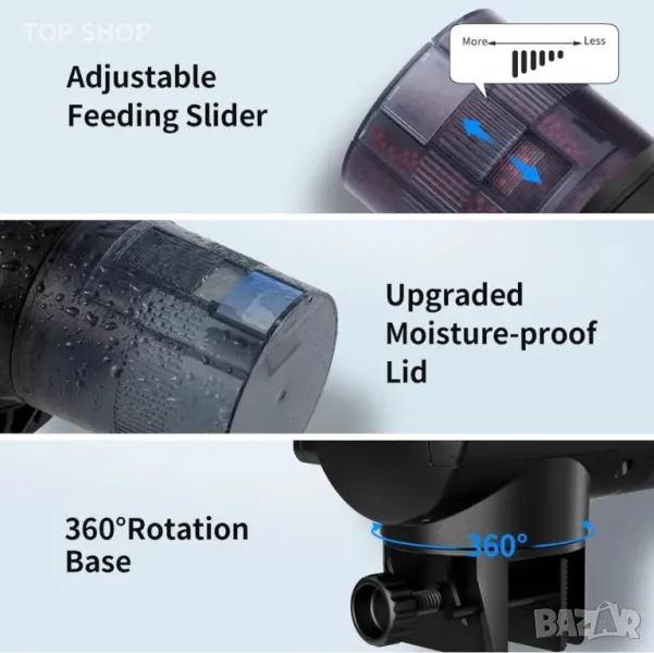 Разнообразни опции за хранене: нашите хранилки са подходящи за хранене с различни фуражи. Гранули и люспи са подходящи за риби, костенурки и скариди и други морски организми; но трябва да се отбележи, че изходът за зърно трябва да работи в суха среда, доколкото е възможно, избягвайте контакт с влага, за да предотвратите блокиране на изхода за зърно.