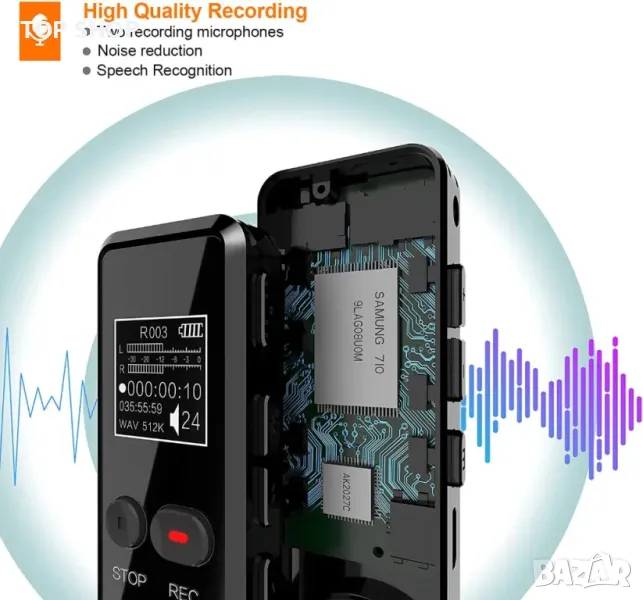 Отлично качество на запис: Ясен запис и два микрофона с динамично намаляване на шума, различен битрейт, по-висок битрейт, по-високо качество на запис, кристално чисти записи и MP3 плейър.