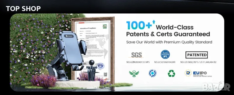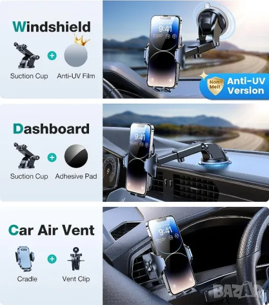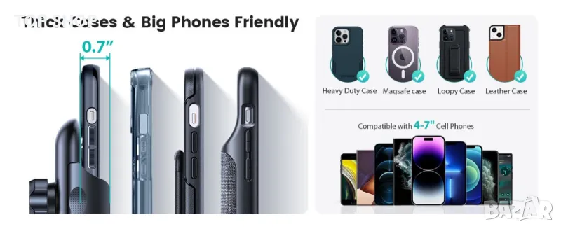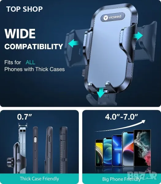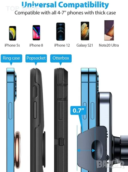 Работа с една ръка: Държачът за мобилен телефон за кола разполага и със система за освобождаване с един бутон, която ви позволява да заключите или освободите телефона си само с една ръка. Пасва добре за всички мобилни телефони между 4''-7'' в ширина и най-дебелият корпус.