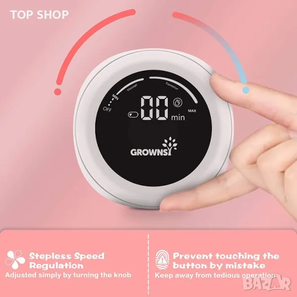 【2 режима на засмукване и непрекъсната скорост】Помпата за кърма GROWNSY включва режими на масаж и изцеждане. Завъртете копчето за непрекъснато, за да изберете необходимата сила на засмукване. Лесен за работа в джоба ви и предотвратяване на случаен контакт