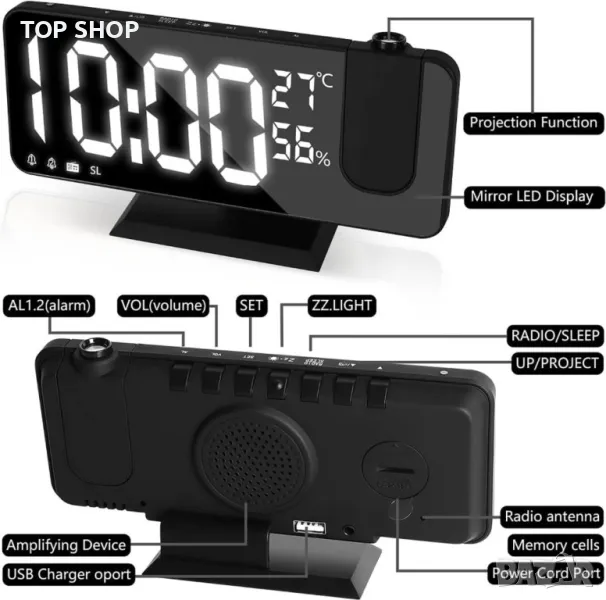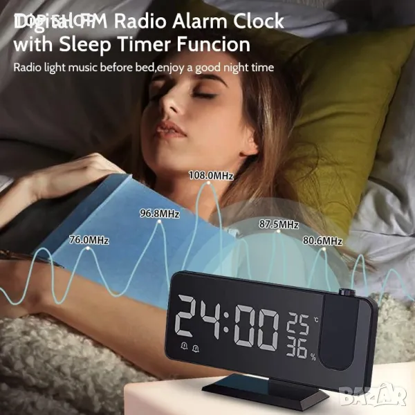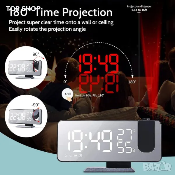 Прожекционен будилник LED дигитален,FM радио,температура и влажност,USB порт за зареждане,огледален