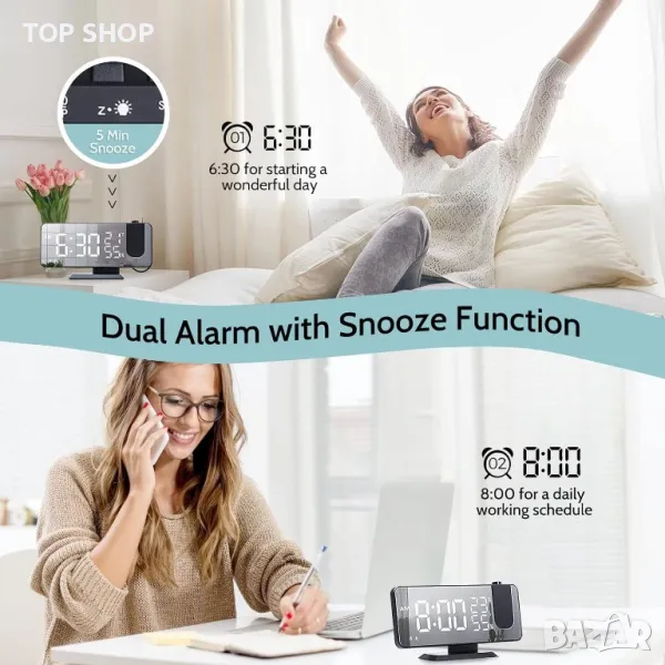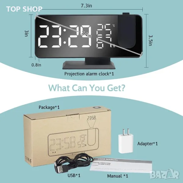 USB ПОРТ ЗА ЗАРЕЖДАНЕ И ПАМЕТ ЗА ИЗКЛЮЧВАНЕ НА ЗАХРАНВАНЕТО: Цифровият будилник с 5V/1A USB изходен интерфейс, можете да зареждате смартфони, когато спите. Функцията за прожектиране работи само чрез променливотоково захранване, но будилникът има и вградена резервна батерия, настройките за час/аларма/радио ще бъдат запомнени дори при прекъсване на захранването.