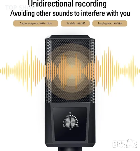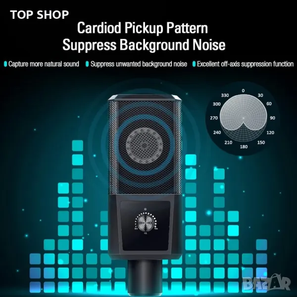 Полярен модел с кардиоиден модел: насоченият микрофон с кардиоиден модел може точно да улови гласа ви и издава ясен, мек и остър звук без досаден шум. Той е много подходящ за подкастинг, видеозапис, предаване на живо, игри, музика или онлайн чат.
