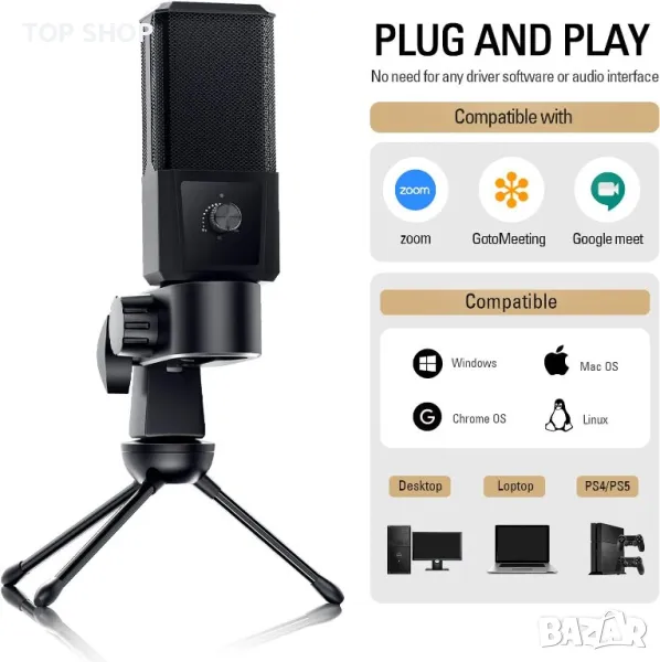 Plug and play: компютърът с микрофон може лесно да бъде свързан към компютри и лаптопи, Windows, Linux чрез USB A към B кабел; предпочитан за офис и домашна употреба. Пакетът включва настолна стойка за микрофон и 2,5 м USB кабел, които ще ви дадат страхотни резултати.