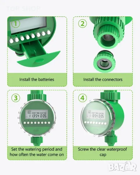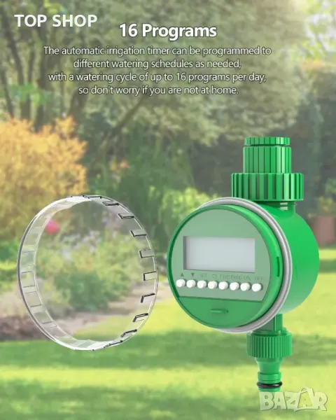 Ключови думи: електронен таймер, програматор за вода, автоматично напояване, градина, тревни площи, земеделска земя, интелигентен клапан, ABS пластмаса, водоустойчив, издръжлив.