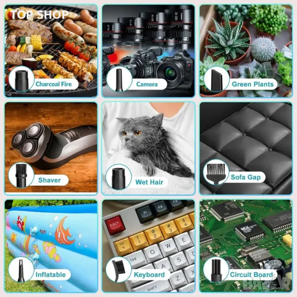Широка гама от приложения: Нашите безкабелни електрически прахоуловители могат да се използват за всяко от вашите скъпи електронни устройства, като колата ви, като компютърни клавиатури, лаптопи, копирни машини, фотоапарати, климатици и китари.
