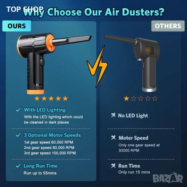 Прахосмукачка със сгъстен въздух HooFun : 100 000 об./мин., 3 скорости
