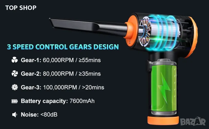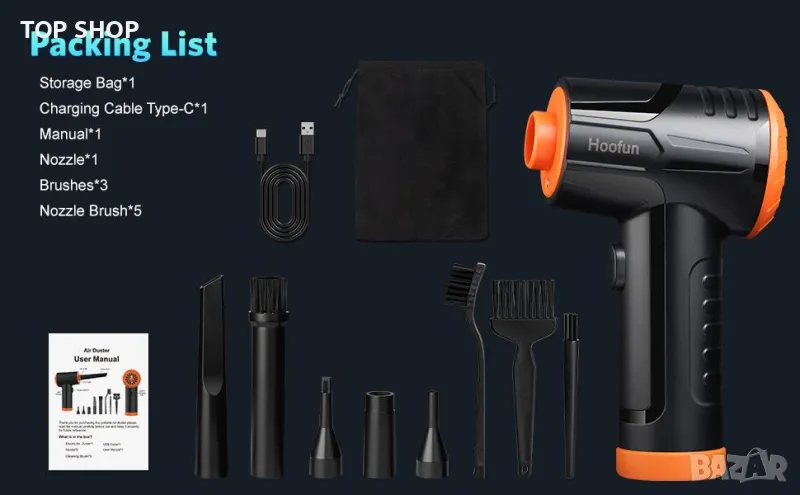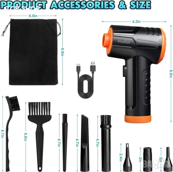 Електрическа пневматична прахосмукачка със сгъстен въздух - USB зареждане: Вентилаторът за почистване на прах Hoofun разполага с голяма вградена батерия и LED светлина от 7600mAh, която може да работи 20-55 минути, за да осигури непрекъснато, ефективно и удобно почистване. Снабден с кабел за зареждане тип C, можете да използвате компютър или зарядно за кола, за да го заредите.