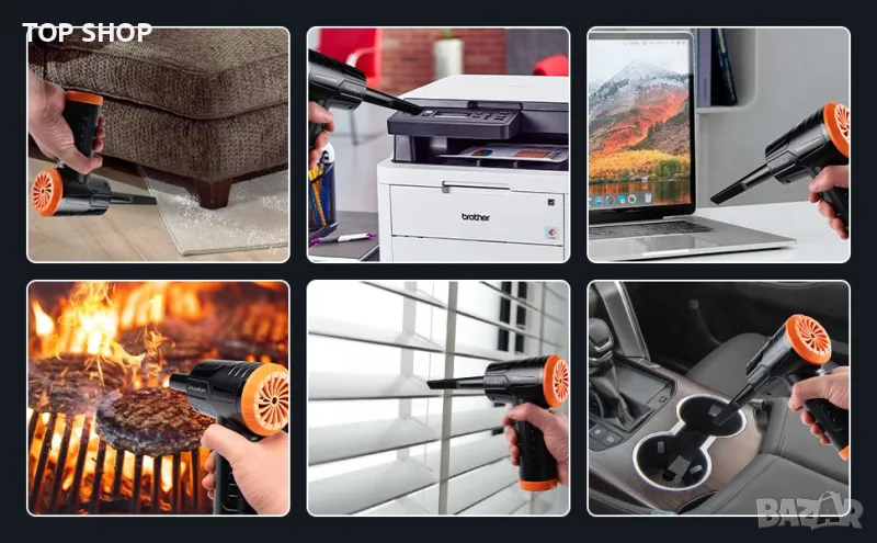 Преносим въздушен вентилатор - Почиствайте навсякъде: На закрито уредът за почистване на клавиатура може да се използва за компютърна клавиатура, дивани, жалузи и стаи за домашни любимци/почистващ уред за почистване на дома на компютри. На открито, поради лекотата на въздухопречиствателя, можете лесно да го носите със себе си в раницата и колата си. Може да се използва върху седалки за кола, багажник и надуваеми постелки за къмпинг и барбекю.