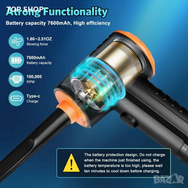 Електрически прахосмукачка със сгъстен въздух Защитен дизайн на батерията, не зареждайте, когато машината току-що е изразходвана, температурата на батерията е твърде висока, моля, изчакайте десет минути, за да се охлади, преди да заредите
