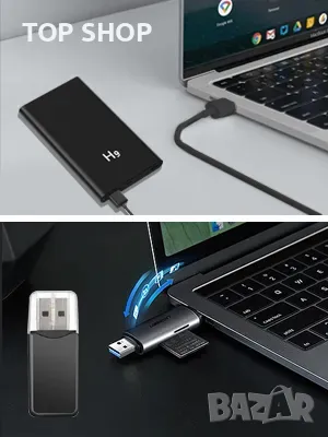 Можете да свържете устройството към компютъра чрез USB кабел (пакетът е включен); ако вашият компютър не може да разпознае устройството чрез USB кабел, моля, извадете SD картата от камерата на Power Bank, след това поставете SD картата в USB четеца на карти и го включете в компютъра; USB четец на карти, включен в пакета.