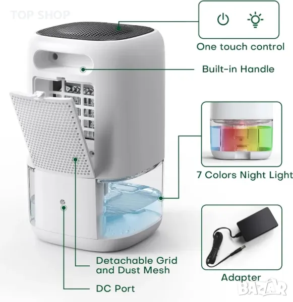 С дръжка и подвижна филтърна мрежа: Влагоуловителите за дома са лесни за преместване поради дръжката, леки, подходящ изсушител за малки стаи. Филтърът на гърба намалява праха и пречиства въздуха.