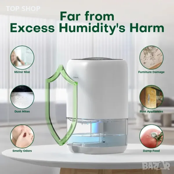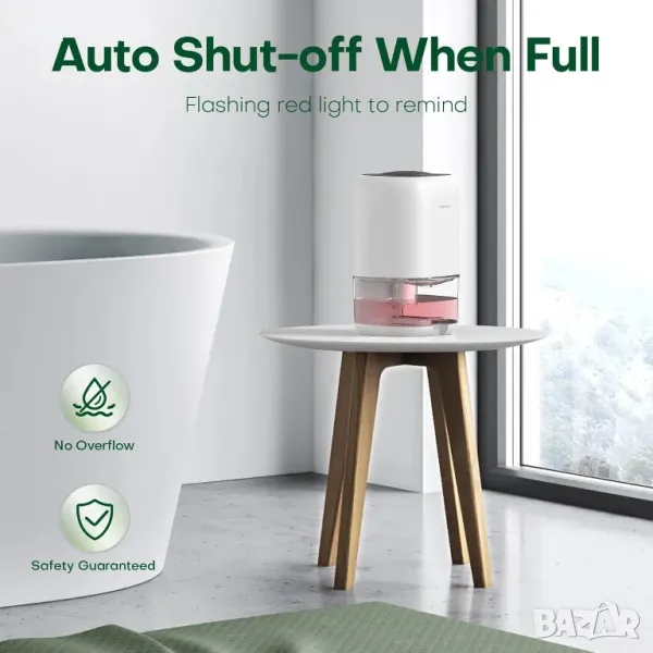 Функция за автоматично изключване: Проектирана функция за автоматично изключване на изсушителя за избягване на преливане на вода. Ще разберете състоянието на съхранение на вода чрез прозрачен резервоар. Когато резервоарът за вода е пълен, LED индикаторът ще светне в червено с 3 „бипкания“, за да ви уведоми, че трябва да се изпразни, за да се предотврати изтичане.
