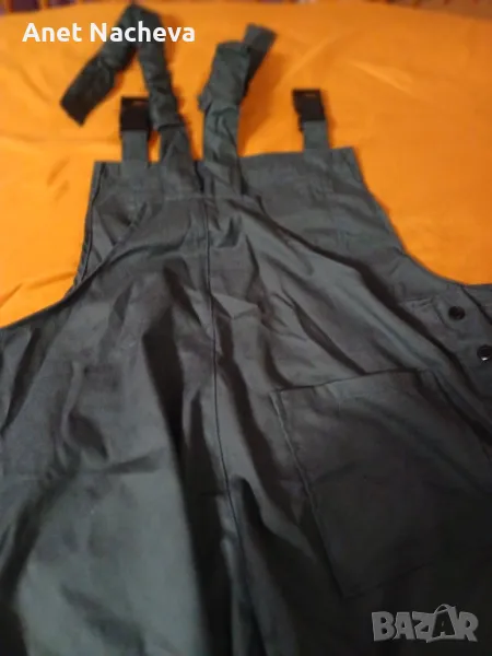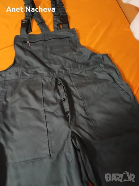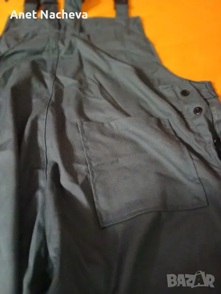 Големина - 58 номер, Дължина крачол - 87см, ханш - 120см, гр.обик - 108см, два джоба големи отпред, един страничен на крачол, гръбен с цип, отзад един външен, закопчава се с копчета и презрамки регулиращи