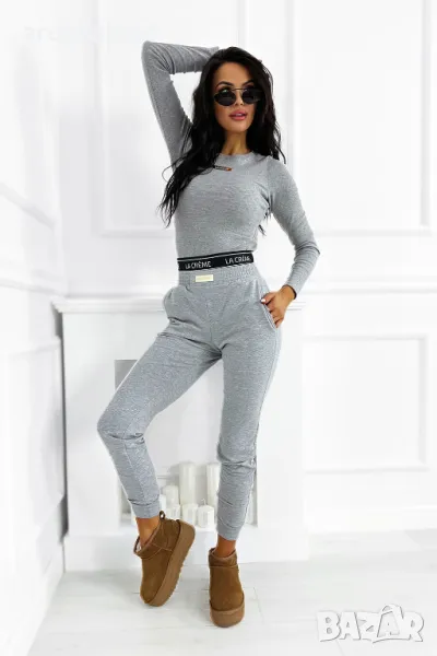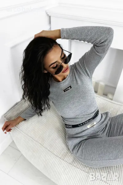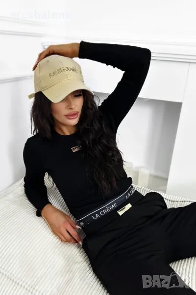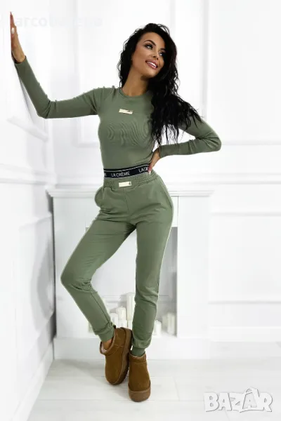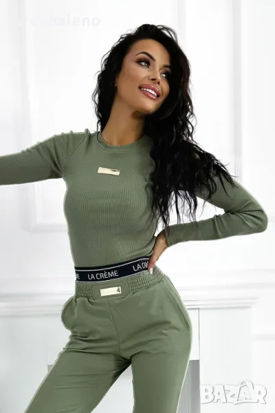 Възхитете се от нашия комплект, който съчетава рипсена блуза с дълъг ръкав с фина златиста кръпка и удобни спортни панталони. Подходящият цвят и черен ластик с лого на талията гарантират стил и комфорт всеки ден. Идеалният избор за всеки повод!