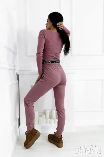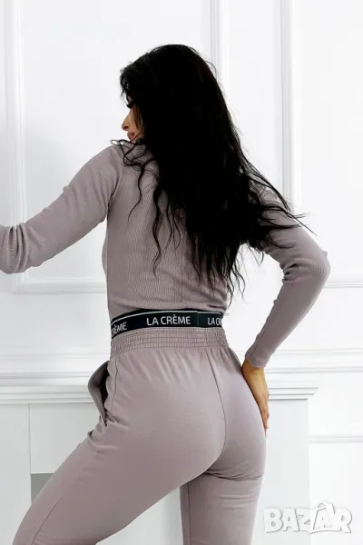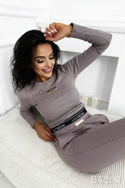 Възхитете се от нашия комплект, който съчетава рипсена блуза с дълъг ръкав с фина златиста кръпка и удобни спортни панталони. Подходящият цвят и черен ластик с лого на талията гарантират стил и комфорт всеки ден. Идеалният избор за всеки повод!