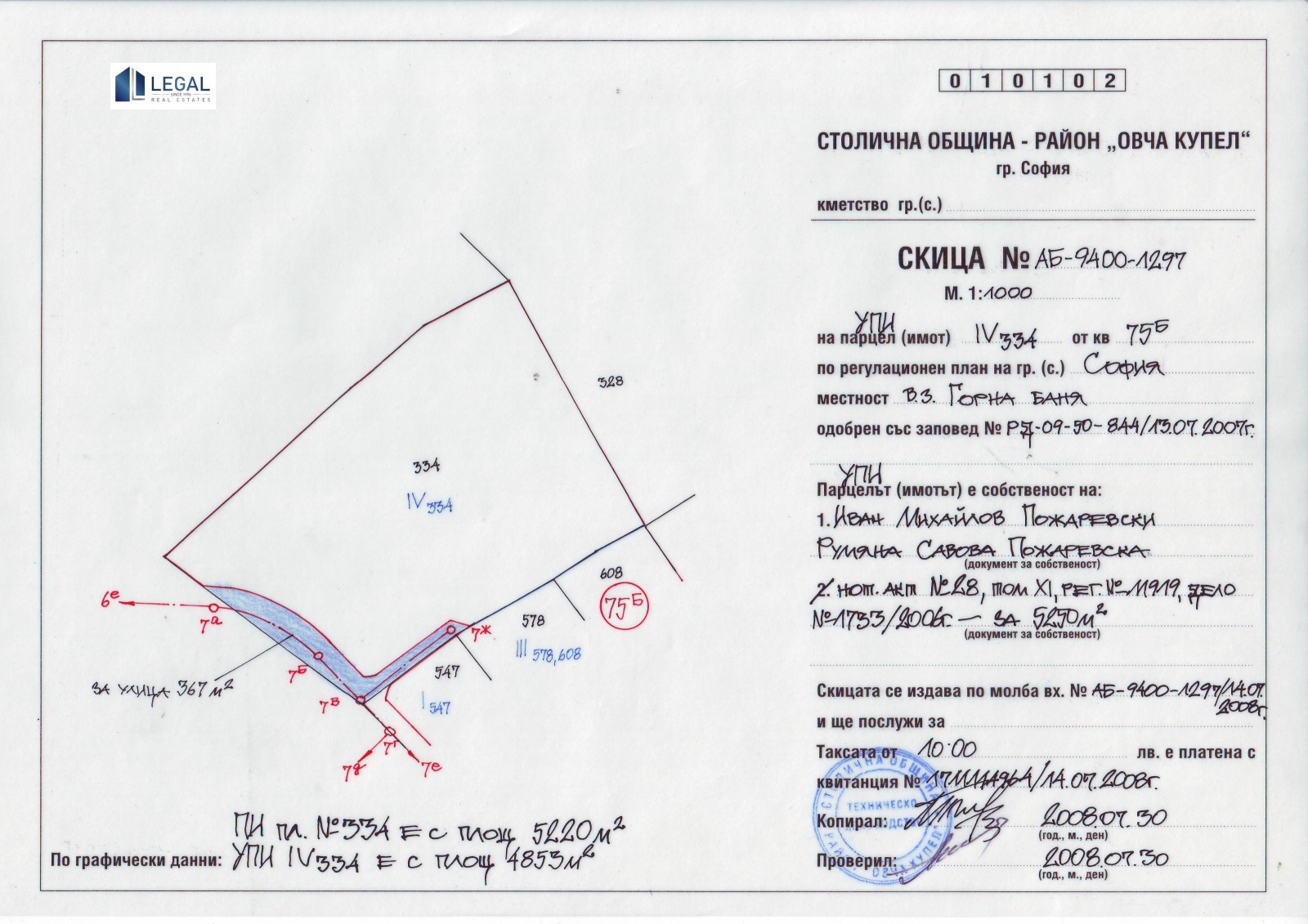 LEGAL REAL ESTATES продава парцел с площ от 5 221 кв.м - УПИ IV - 334, квартал 75Б, кадастрален номер 68134.4162.29. Парцелът се намират във високата част на кв. Горна Баня, местност 'РУСОЛЕТЕ', вляво от адвокатските къщи, с панорама към София. Целогодишен достъп и подход, ток и вода в съседство. Застроени нови престижни имоти в близост. До зелена и чиста зона. Устройствена зона: Жм1 с устройствени параметри: Максимална плътност на застрояване 40%; Кинт 0.9; Мин. озел. площ 60%. За контакти: Ивайло Вълков - 0882 30 60 60